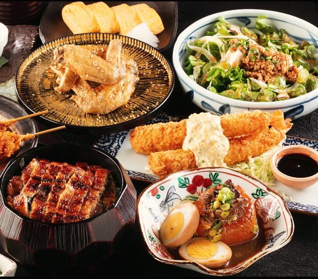 一本鰻のひつまぶし、手羽先の甘醬油唐揚げ、味噌串カツ、海老天むす、岡崎の八丁味噌おでん、海老フライ、名古屋コーチンなどの名古屋めしをご堪能ください‼︎