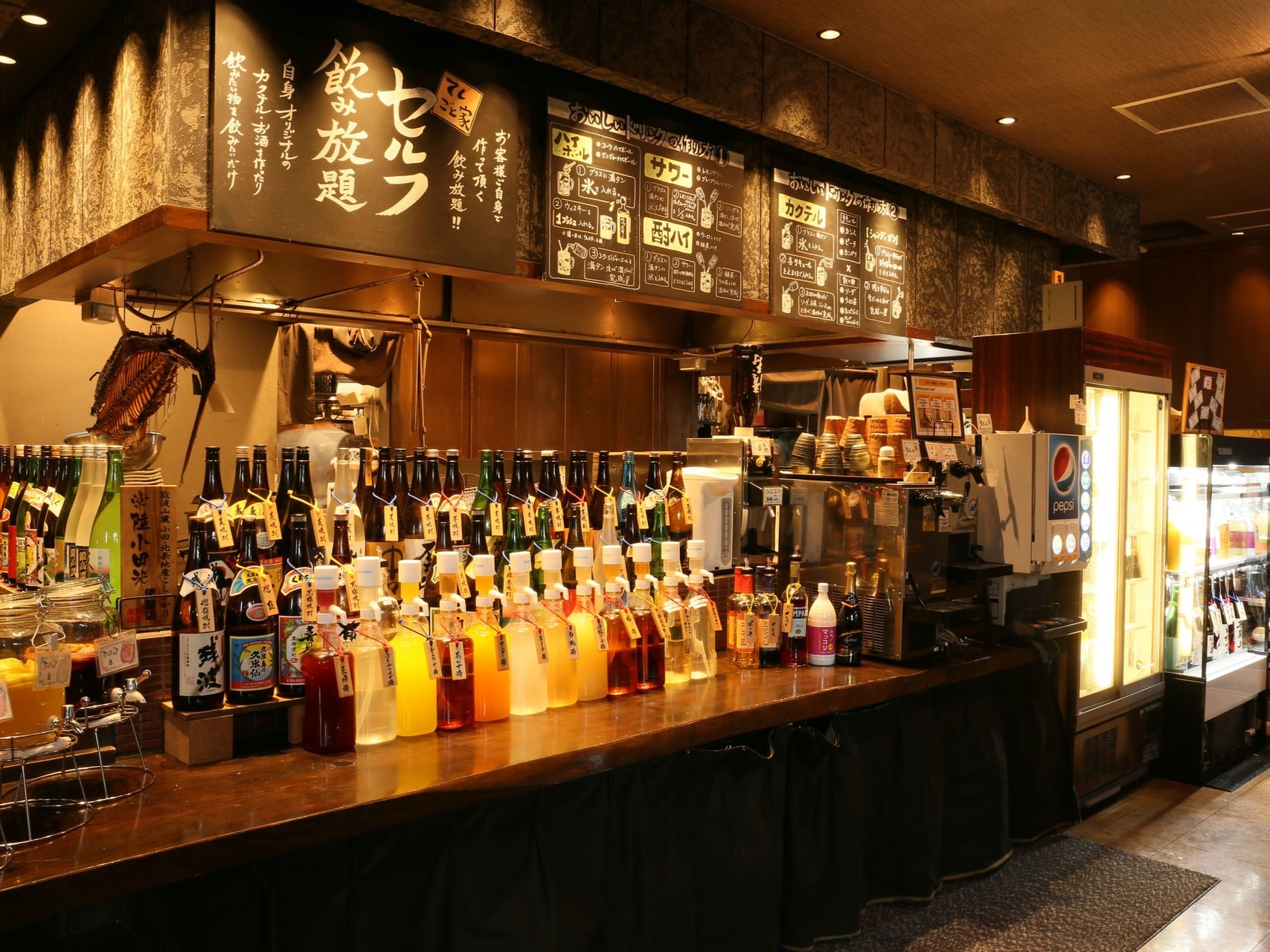 当店名物【100種類セルフ飲み放題】 は毎日開催しております!平日の月~木は990円、金土日・祝日・祝前は1320円でお楽しみいただけます(大人60分価格)。ご自身で作っていただくので、割り方も濃さも作るタイミングも自由!焼酎や日本酒・ソフトドリンクも飲み放題です。もちろん単品でのドリンクご注文も承ります。